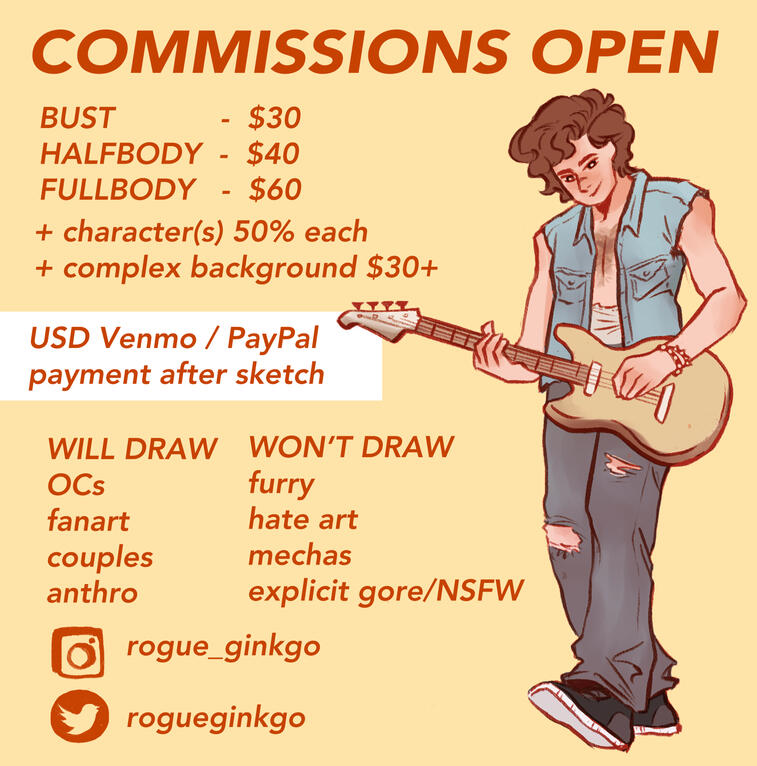 > Payment is 100% upfront after the sketch OR half before the sketch and half after the sketch stage.> I only accept USD via Venmo / PayPal.> Refunds are not accepted past the sketch stage.